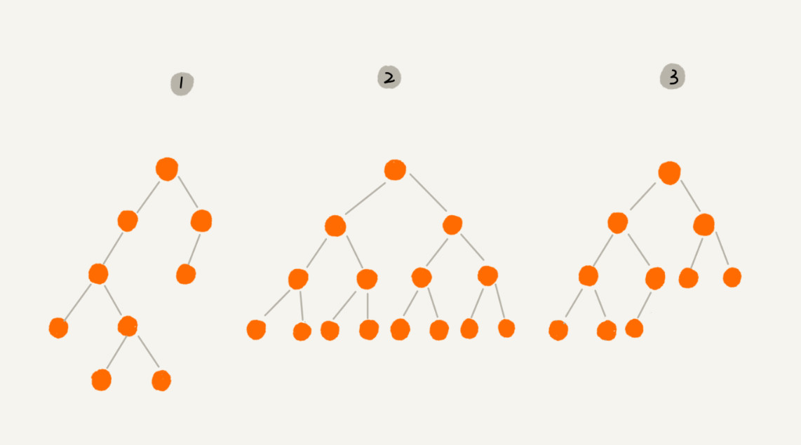 编号3的二叉树中,叶子节点都在最底下两层,最后一层的叶子节点都靠左排列,并且除了最后一层,其他层的节点个数都要达到最大,这种二叉树叫作完全二叉树。