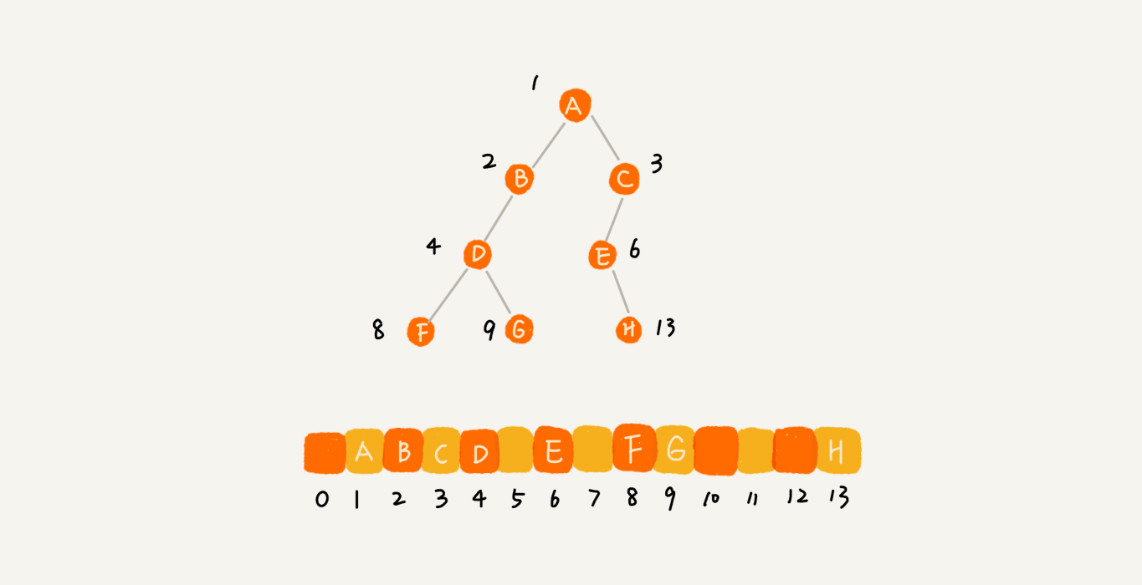 我来总结一下,如果节点X存储在数组中下标为i的位置,下标为2 * i 的位置存储的就是左子节点,下标为2 * i + 1的位置存储的就是右子节点。反过来,下标为i/2的位置存储就是它的父节点。通过这种方式,我们只要知道根节点存储的位置(一般情况下,为了方便计算子节点,根节点会存储在下标为1的位置),这样就可以通过下标计算,把整棵树都串起来。