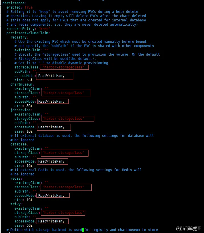 storageClass: "harbor-storageclass" # 前面创建的StorageClass,其它组件同样配置