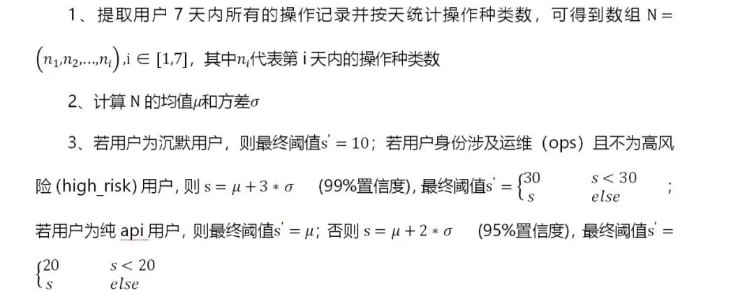阈值即一个用户在某个场景下统计量的预期最大值,但是不同身份的用户的预期值是不一样的,例如一个运维用户和一个普通观察用户的预期值不一样,运维用户根据工作量和负责事务的不同预期最大值也不一样。因此阈值生成模块的目的是根据该用户历史的数据以及用户身份自动生成用户在每个场景下的检测阈值。