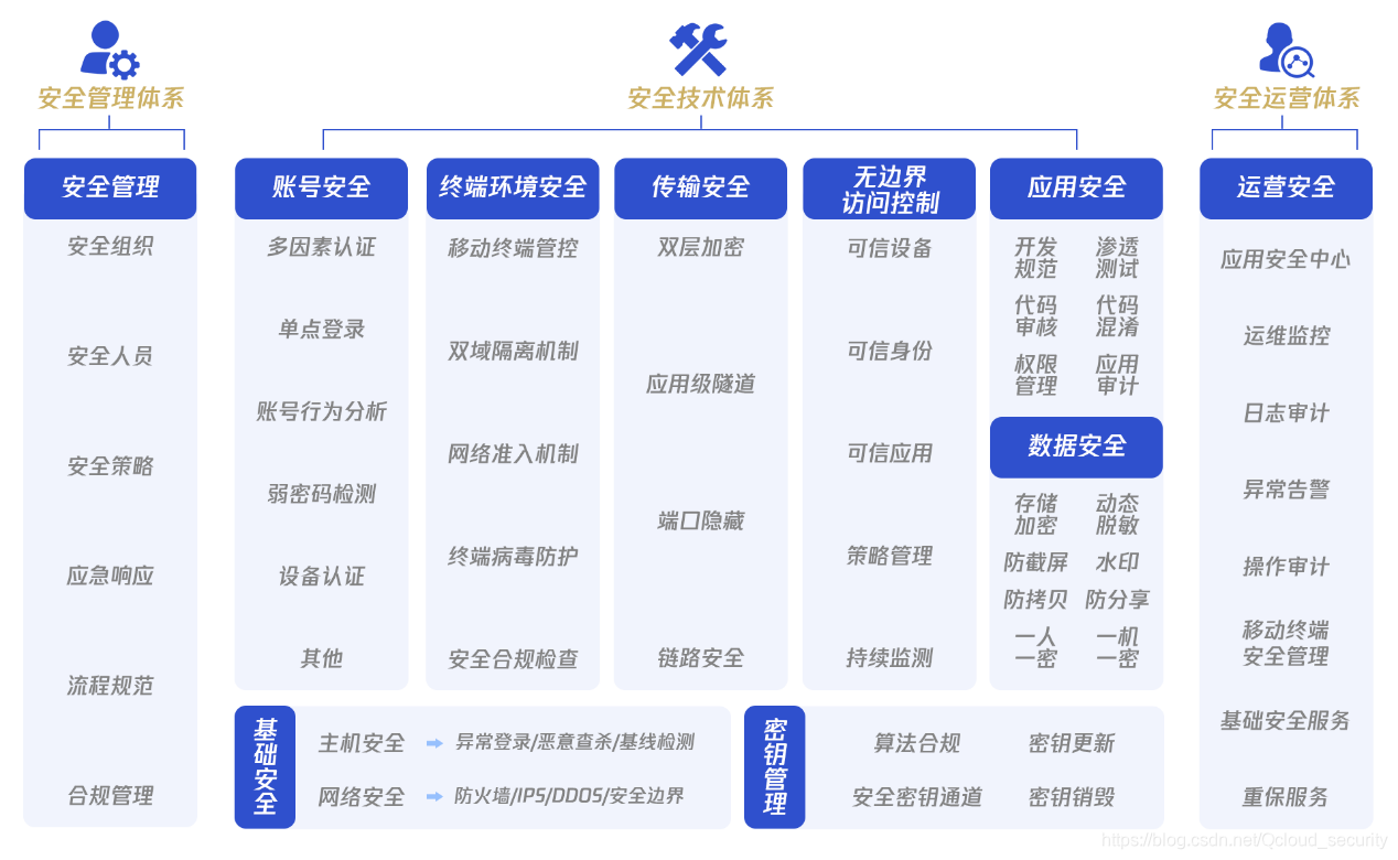 结合政务业务场景与管理需求,搭建出了涵盖安全技术、安全管理、安全运营三大体系在内的能力框架,致力为移动政府场景构建全方位的安全壁垒。如下图所示: