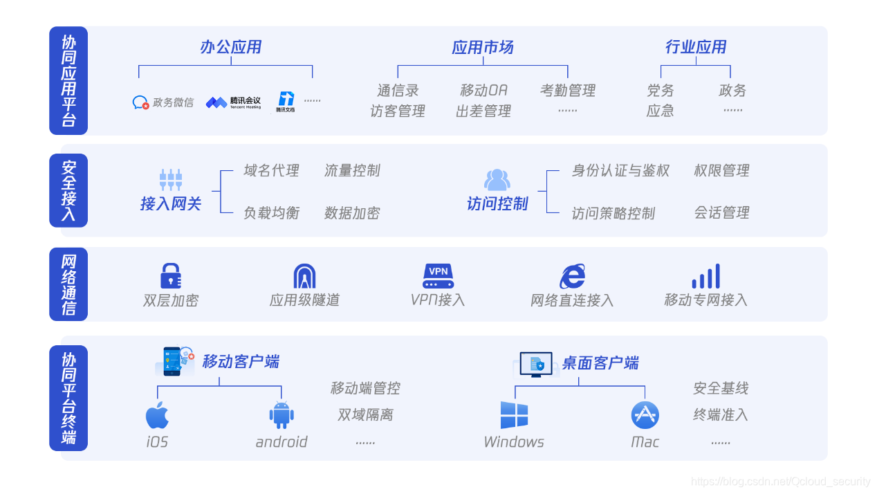 在对政务协同面临的安全威胁进行深度分析的基础上,《白皮书》给出了腾讯政务协同平台安全保障的顶层设计框架,并详细介绍了最佳安全实践。针对政务协同办公和业务应用在实际场景中面临的终端、传输、应用及数据安全威胁,腾讯政务协同平台从原生架构出发,对终端、通信网络、安全接入以及平台服务端四大业务场景进行安全强化,实现安全架构的全面升级。