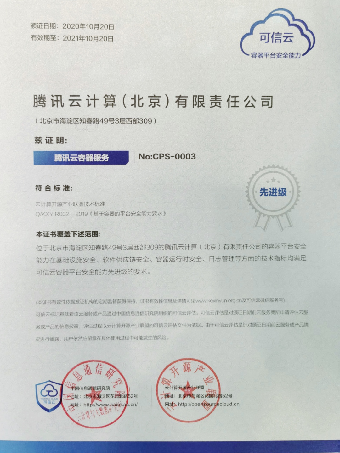 腾讯云容器服务获信通院最高级认证