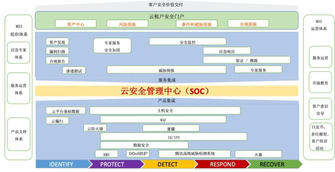 腾讯持续在云上为租户提供原生的安全防护产品,如云SOC、云 Waf、云防火墙等。客户上云后,可以自选符合业务需要的安全产品,一键开合、按量付费,显著降低安全部署的成本,消除安全运营门槛、提升整体的安全水位。据了解,目前,腾讯云的漏洞情报能力已经覆盖数百个情报源,能够在分钟级定位新出现的安全漏洞及影响范围,在日级以内实现全网的安全漏洞处置。