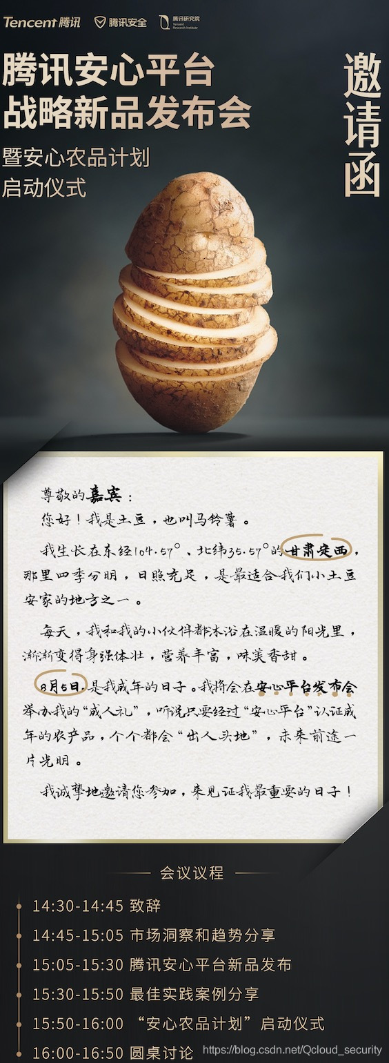 腾讯计划运用产业互联网技术帮助中国农村的优质农产品通过码链追溯建立品牌,旨在让小土豆、香菇、苹果等更多地标农产品走进城市。8月5日14:30-17:00,腾讯将在“腾讯安全”视频号举办“数字兴农”公益行动发布会,敬请关注。