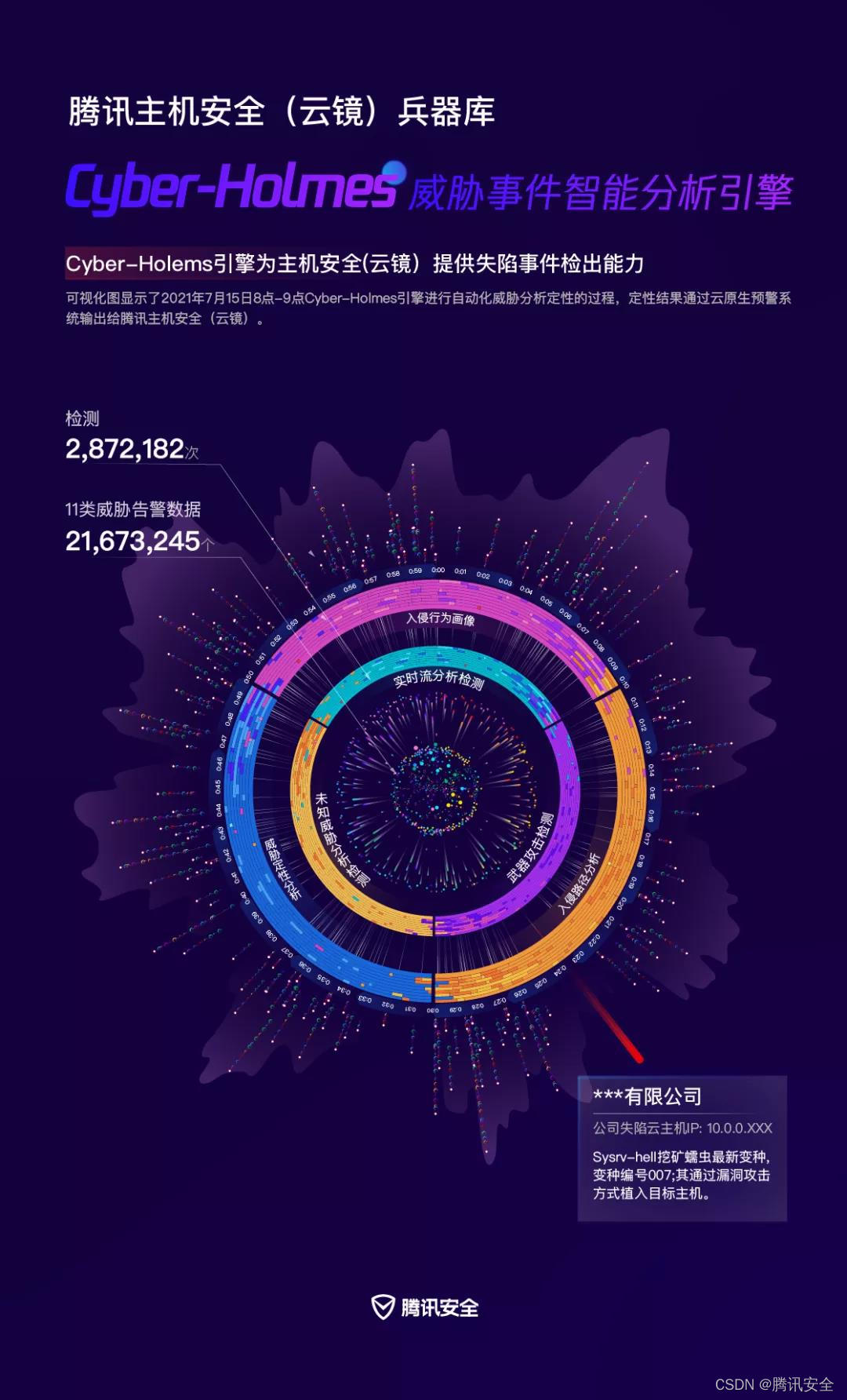 腾讯安全Cyber-Holmes引擎7×24小时不间断无人值守运行,Cyber-Holmes引擎已申请相关专利十余项,分析归因活跃病毒黑产家族1922个,该引擎已是构成腾讯安全中台能力的基石引擎。其能力目前已接入腾讯主机安全(云镜)、腾讯云安全运营中心(云SOC),功能体现为云原生预警系统和威胁事件调查能力,Cyber-Holmes引擎将持续接入腾讯更多企业级、消费级安全产品,服务于全体客户。