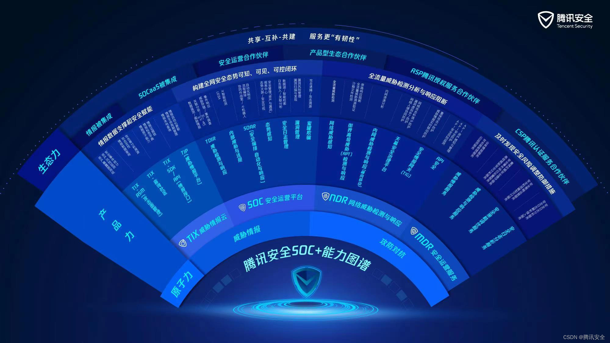 腾讯安全基于20多年攻防实战经验,业内顶尖安全实验室的安全能力、算法算力平台的安全大数据和AI技术,率先推出腾讯“SOC+安全运营体系”,通过原子力、产品力和生态力打造全新的安全运营体系与架构。腾讯SOC+集成了TIX威胁情报中心、SOC安全运营平台、NDR网络威胁检测与响应、MDR安全运营服务四大产品矩阵,助力政企机构全面提升安全防护能力和安全运营效率。