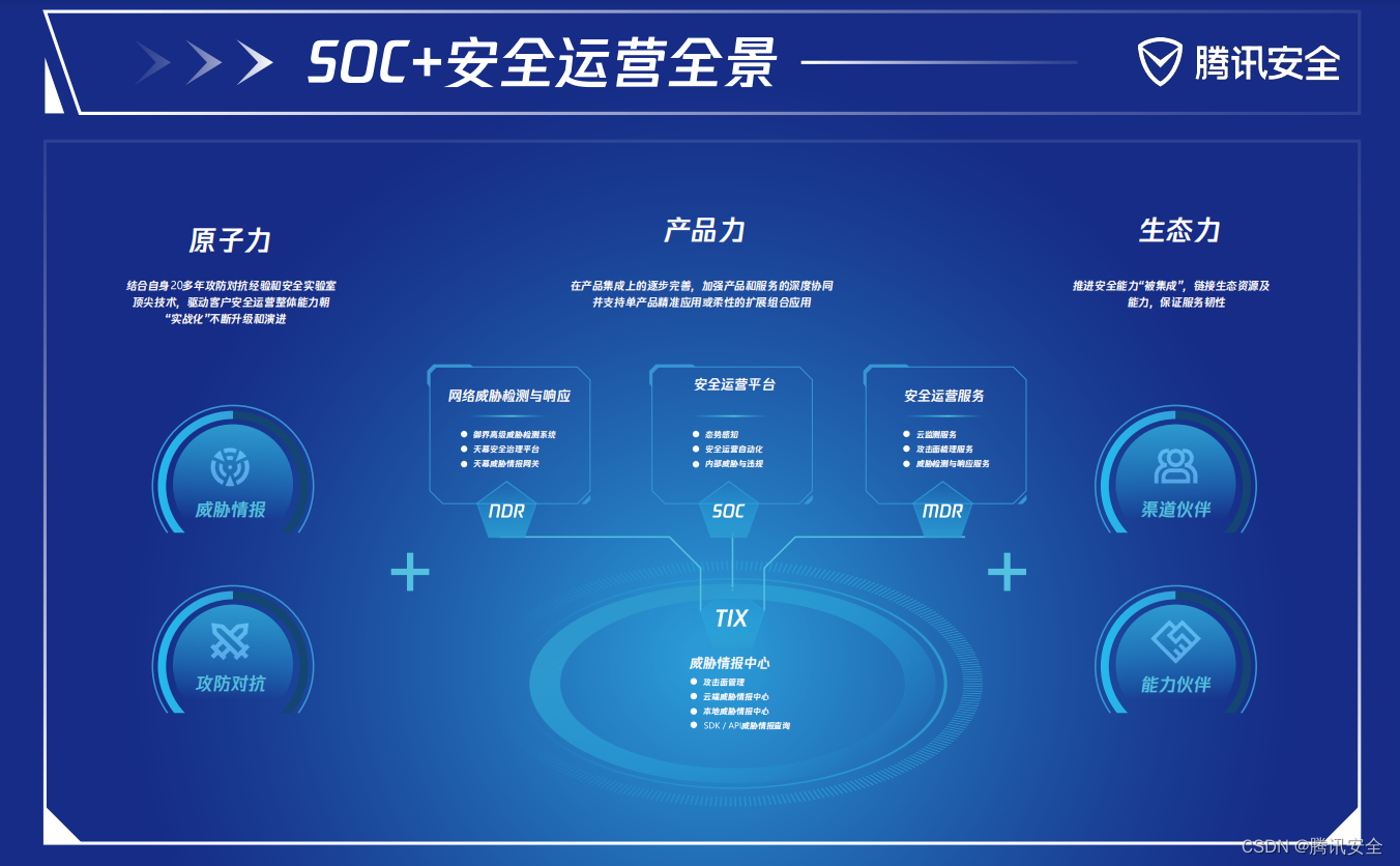 本文探讨了腾讯基于云计算、人工智能等技术的创新,如何通过'SOC+'安全运营体系,整合原子力、产品力和生态力,帮助企业应对网络安全挑战,提升整体安全防护和运营效率。重点介绍了TIX威胁情报中心、SOC安全运营平台、NDR网络威胁检测与响应和MDR安全运营服务四大产品矩阵,以及它们在构建闭环安全体系、实战化防御和全行业生态合作中的作用。