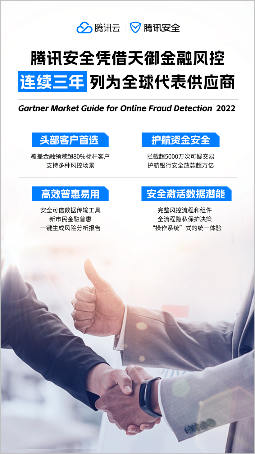 近日,全球研究机构Gartner发布了2022《在线反欺诈市场指南》(Market Guide for Online Fraud Detection)。腾讯安全凭借天御(TenDI)金融风控被列为全球代表性厂商,这也是腾讯安全连续第三次被列入该报告。