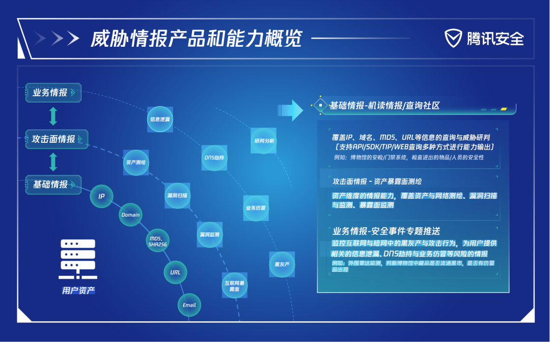 腾讯TIX威胁情报中心是一款集成基础情报、攻击面情报、业务情报三大情报能力的开放平台,提供覆盖C端、B端、云端、互联网开放数据等多个维度的数据采集,以及业界领先的威胁情报云能力,自产情报数量占比95%以上,同时依靠独特的威胁情报云端协同能力,对产品赋能,实现基于威胁情报和重大安全事件全天候响应分析。