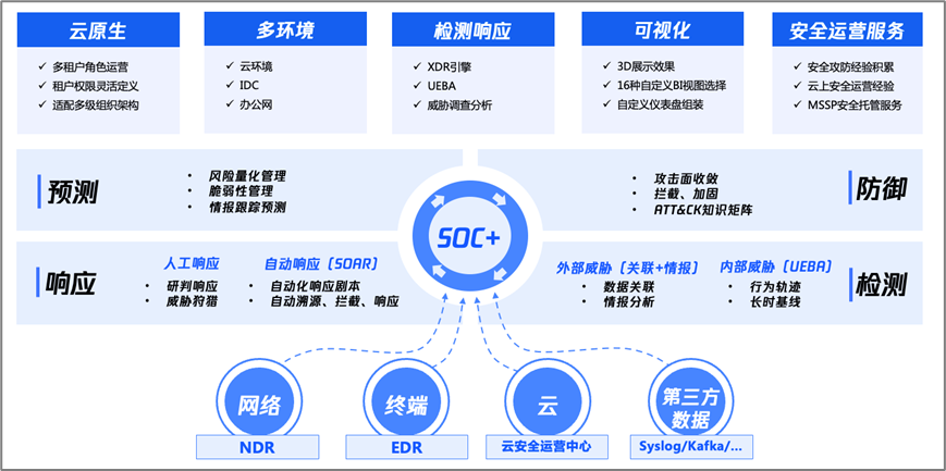 SOC+安全运营体系以“威胁情报”和“攻防对抗”为原子能力,结合自身20多年攻防对抗经验和安全实验室顶尖技术,构建“TIX威胁情报云”,实现安全能力SaaS迭代。“SOC+安全运营体系以“TIX威胁情报云”为原点核心,持续丰富产品矩阵: