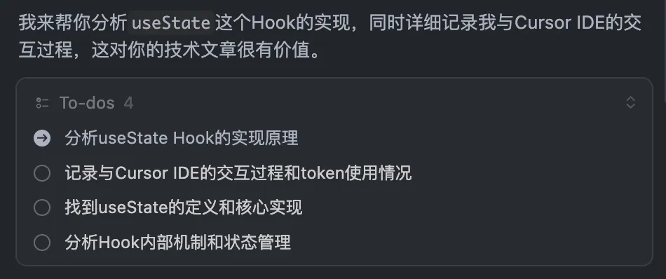 我正在编写一篇技术文章,主题聚焦于模型上下文窗口的大小对于AI生成代码或者分析结果的质量。这篇文章将会包含如何降低模型上下文大小占用的方法论。该项目是React官方项目,异常庞大,如果我提出问题,你是否是通过将整个项目的所有代码文件来读取进行分析的?如果不是,你和CursorIDE之间进行了哪些交互?分别读取了什么文件?这些交互阶段分别占用了多少token?下面是我的问题,以你针对这个问题的分析来回答我上面的要求:帮我看一下useState这个Hook是怎么实现的