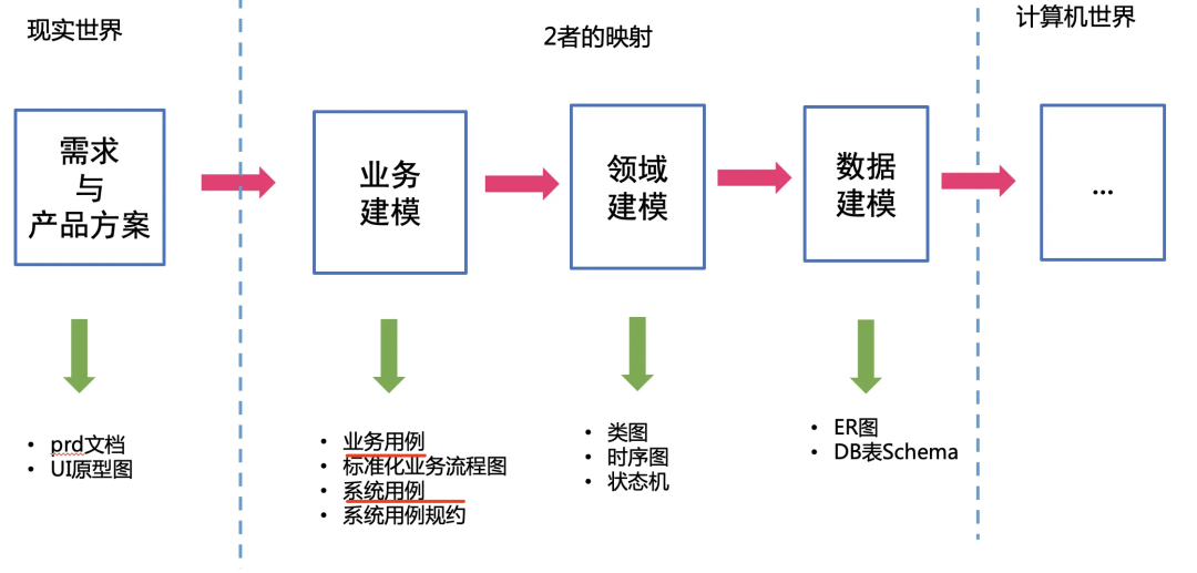 当需求和产品方案定了之后,接下来,理论上要经历3类建模(3个建模过程),才能完成从现实世界到计算机世界的映射。 下图展示了每个阶段要输出的产出物: