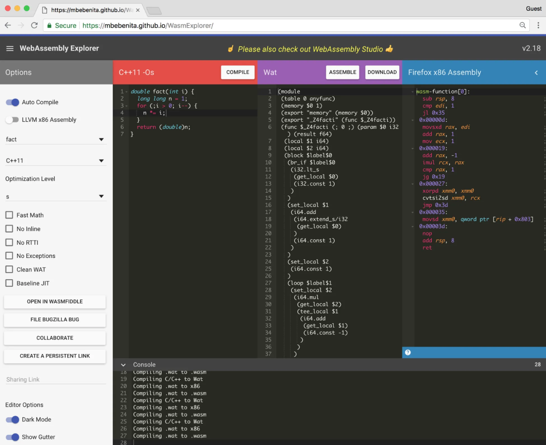 WebAssembly is a new type of code that can be run in modern web browsers — it is a low-level assembly-like language with a compact binary format that runs with near-native performance and provides languages such as C/C++, C# and Rust with a compilation target so that they can run on the web. It is also designed to run alongside JavaScript, allowing both to work together. |