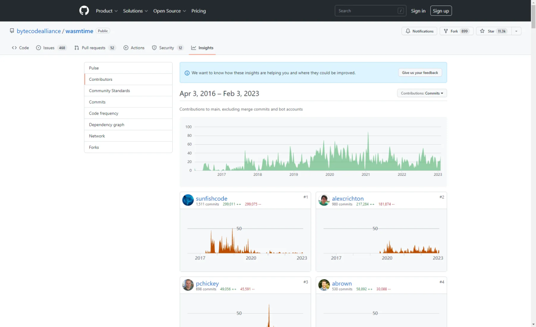 WASI 实际上是一个标准,目前最主流的实现方案是 Bytecode Alliance 使用 Rust 开发的 Wasmtime。截止到我写这篇文章的时候已经有11.3K的 star。看了最新 git 记录,整个开发应该是仍然处于"疯狂打码中"的状态。