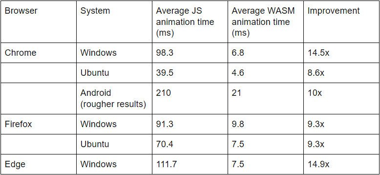 这是在17年 Wasm 诞生之初的测试,可以看到在不同的环境下 Wasm 比标准JS快了8-15倍。随着 JS 的不断优化,现在再去测试可能就不会有这么大的差异了。更重要的是,这个测试用例不一定能代表真实的 Web 应用,真正的 Web 应用可能不会命中这么多"优化项",8倍以上的性能差异往往只存在于测试用例中。这里我必须再重复一下就是,Wasm 快10%到1000%都有可能,不同的测试环境下不可一概而论。