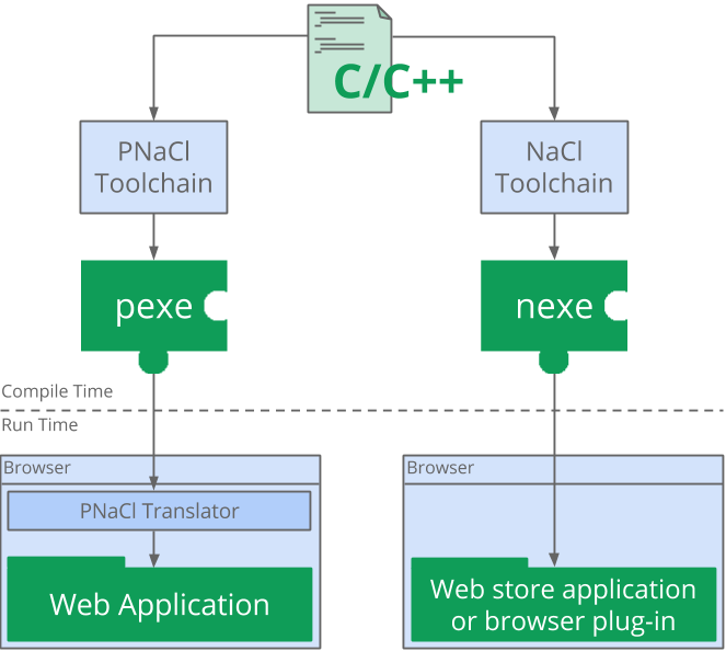 Google 在很早之前也一直致力于研究如何让 C/C++能够在 Chrome 里运行起来,并在2009年的安全领域顶级会议 IEEE Symposium on Security and Privacy 发表了 Google 的技术方案 NaCl(Google Native Client)以及 PNaCl(Portable Google Native Client)。NaCl 的本质也是一种沙盒技术,使用工具链编译后的 C/C++代码能够以接近原生应用的速度在 web 端运行,也可以与 JS 和 webapi 进行交互。NaCl 在安全这块做了大量的设计,其使用了内外双层沙盒,并利用 x86 内存分段机制来隔离内存,甚至还用上了静态代码分析技术来做沙盒里运行的程序进行检查。
