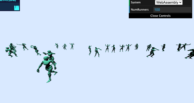http://aws-website-webassemblyskeletalanimation-ffaza.s3-website-us-east-1.amazonaws.com/)。感兴趣的同学可以在自己浏览器里尝试一下,当 3D 人物数量为100时 JS 版本会有明显卡顿,切换到 Wasm 则不会有卡顿感。