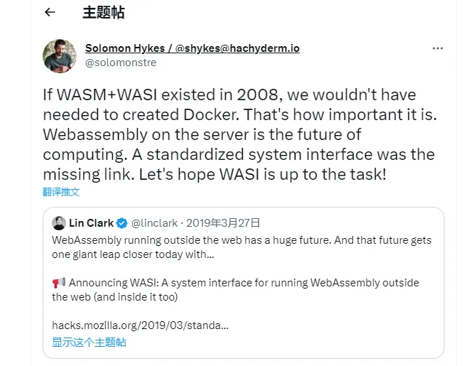 如果2008年的时候,WASM 和 WASI(WebAssembly System Interface, WASM系统接口)这两个东西已经存在了的话,我们就没有必要创立 Docker 了。在服务器上运行 WebAssembly 是计算的未来,目前缺少的就是一个标准的系统接口,希望 WASI 能够弥补上这块缺失的拼图。 |