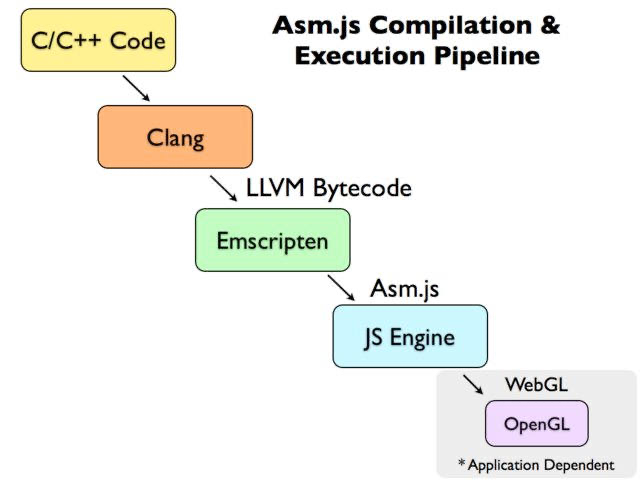 2012年 Mozilla 的工程师在研究 LLVM 时,突然脑洞大开提出了一个想法:类似游戏引擎这样的高性能应用大多都是 C/C++语言写的,如果能将 C/C++转换成 JavaScript ,那岂不是就能在浏览器里跑起来了吗?如果可以实现,那么浏览器是不是也就可以直接跑 3D 游戏之类的 C/C++应用?于是 Mozilla 成立了一个叫做 Emscripten 的编译器研发项目,Emscripten 可以将 C/C++代码编译成 JavaScript,但不是普通的 JS,而是一种被特殊改造的 JS,其被命名为 asm.js。