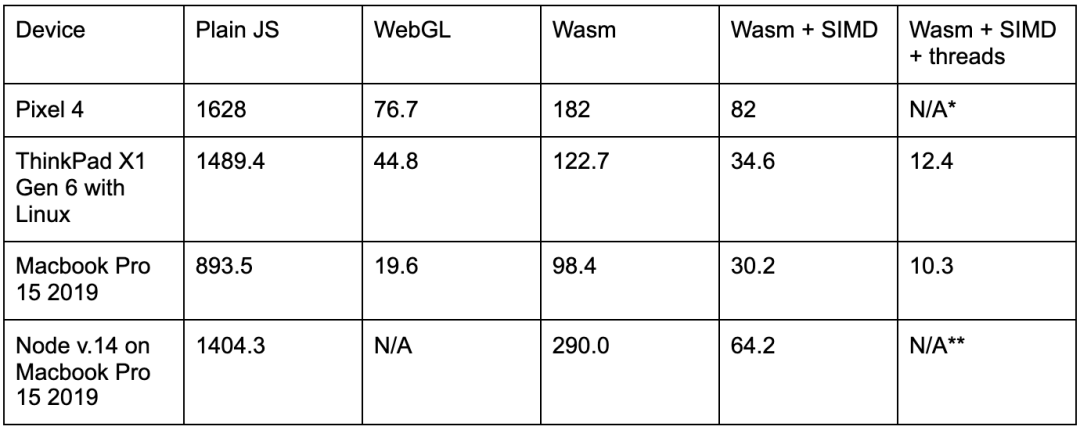TensorFlow.js 从2.1.0 开始支持 SIMD,从 TensorFlow.js 2.3.0 开始支持多线程。Wasm SIMD 是 wasm 标准第3阶段的提案,Wasm threads 是 wasm 标准第2阶段的提案,目前绝大多数浏览器环境都可支持该两种能力。SIMD 和多线程的性能增益彼此独立。TensorFlow的基准测试表明,SIMD 为普通 Wasm 带来了 1.7-4.5 倍的性能提升,而多线程在此之上又带来了 1.8-2.9 倍的加速。