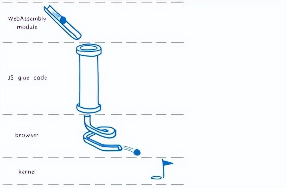 如下图所示:WebAssembly 运行在浏览器内,与系统交互靠的是 JS 胶水语言的能力,JS 通过浏览器内核再到操作系统内核。而 WebAssembly 脱离了浏览器后,运行在各个操作系统中也需要抹平系统 api 的差异性,这就是 WASI 需要解决的问题。