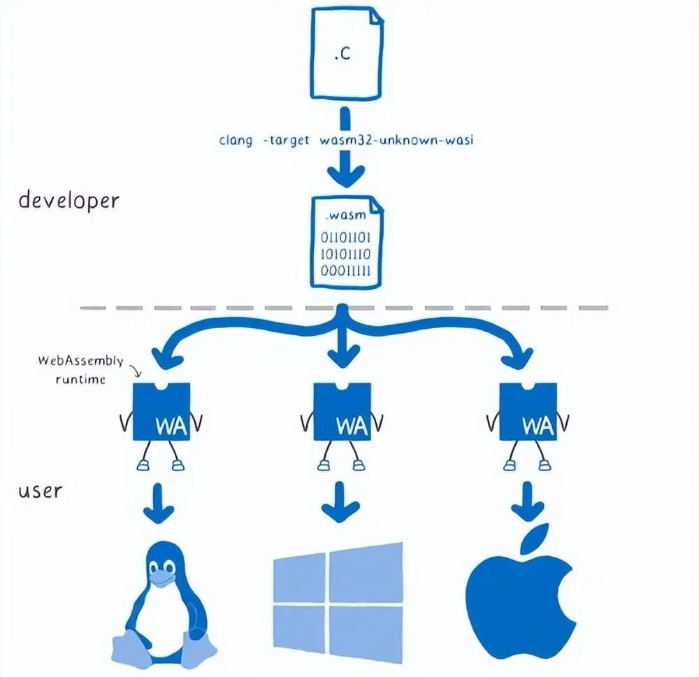 wasm 是二进制级别的跨平台,这种可移植性让用户分发代码更容易。wasm 只需要被提前编译一次,就能在不同操作系统上运行。在编译的时候并不确定其目标平台,wasi 这里实际需要的是一个跨平台的 runtime!如下图所示:C 源码只被编译了1次,.wasm 通过 WebAssembly runtime 运行在不同系统中。