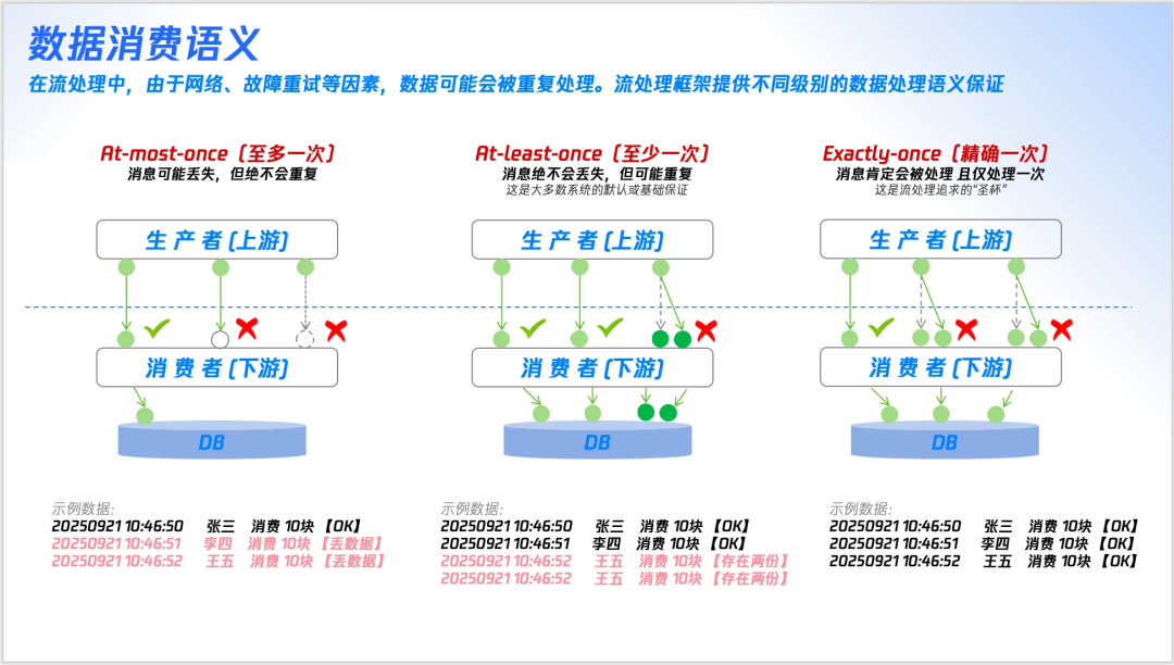 在流处理中,由于网络、故障重试等因素,数据可能会被重复处理。流处理框架提供不同级别的数据处理语义保证,这是流处理深度的体现: