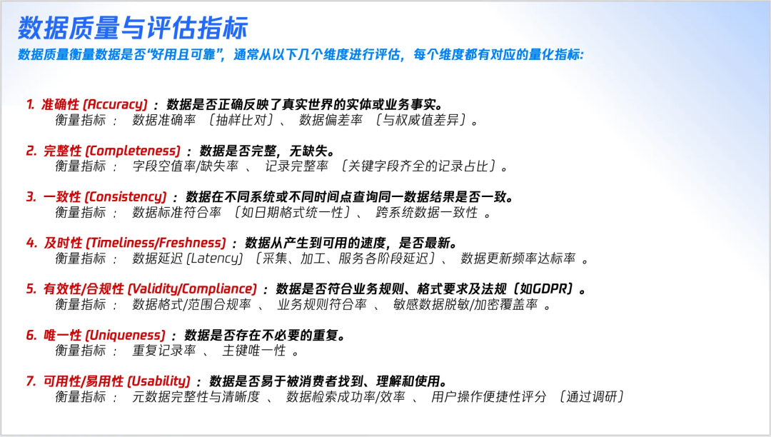 数据质量绝非运行几个 SQL 检查脚本那么简单,其深度在于 工程化、自动化、可观测的系统性建设 。数据质量衡量数据是否“好用且可靠”,通常从以下几个维度进行评估,每个维度都有对应的量化指标: