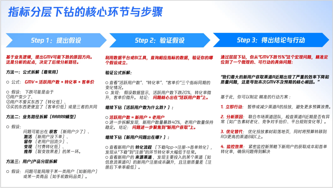 通过层层下钻,你从“GMV下跌15%”这个宏观问题,精准定位到了一个微观的、可行动的具体问题: