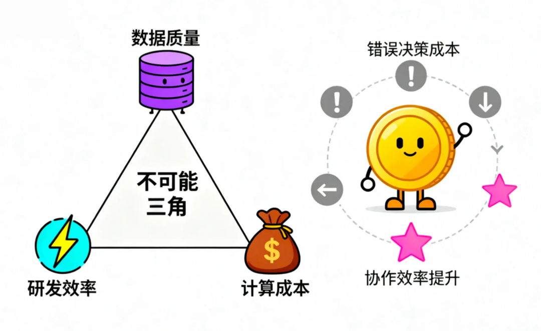 任何数据质量讨论都必须始于承认一个核心矛盾:数据质量、研发效率、计算成本 构成一个“不可能三角”。追求极致质量必然牺牲效率和成本。我们的目标不是追求100%准确,而是找到 业务可接受的、性价比最高的质量平衡点。