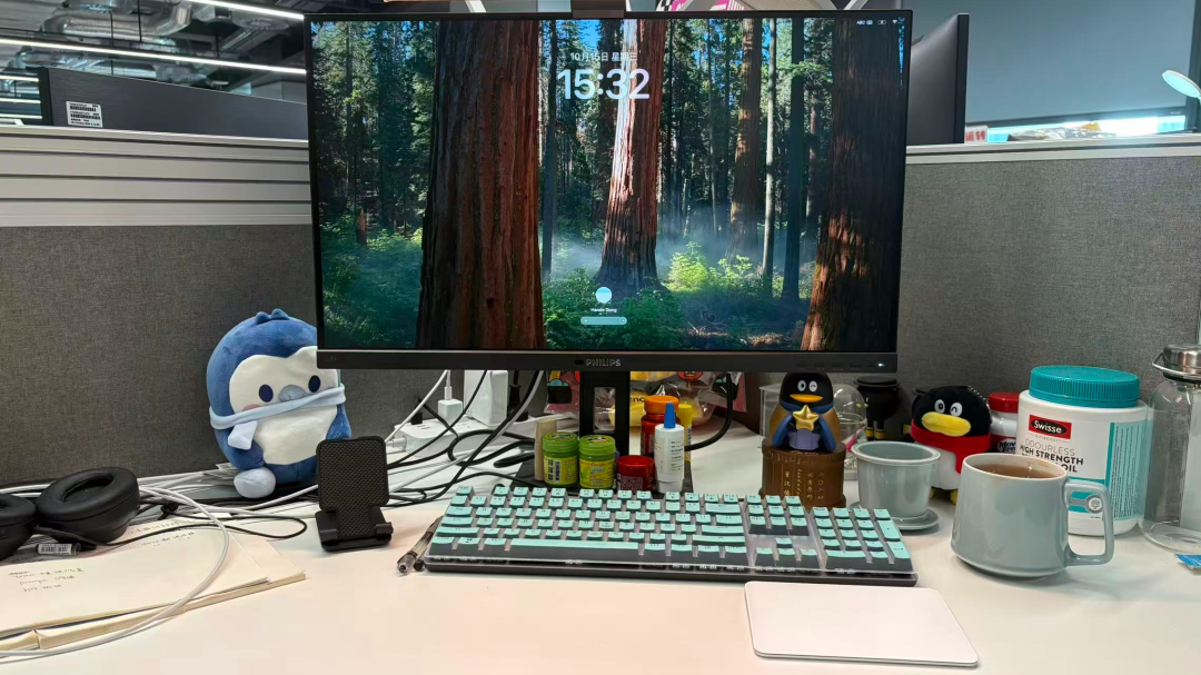 我的工位其实很简陋,没有什么特别的装备。我比较喜欢简约的风格,看着干净整洁。就一个水杯,一个键盘。