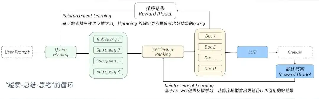 - RL-Based Retriever 利用 Answer 效果反馈学习,基于 LLM 对 Query / SearchDocs 的后验满意度信号、Answer 的正确性、Answer 中对 SearchDocs 的引用等信号计算 reward,通过 RL 对齐到 retrieval 阶段的 ranking 或者 embedding model。
