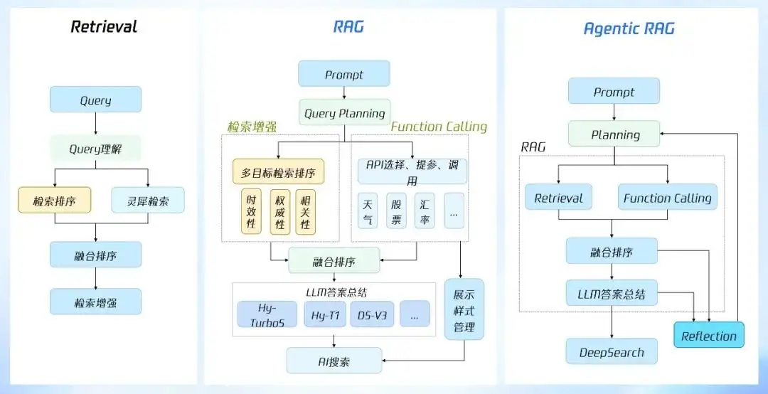 搜索技术架构经历了从传统 Retrieval 到 RAG 再到 Agentic RAG 三个阶段的演进。