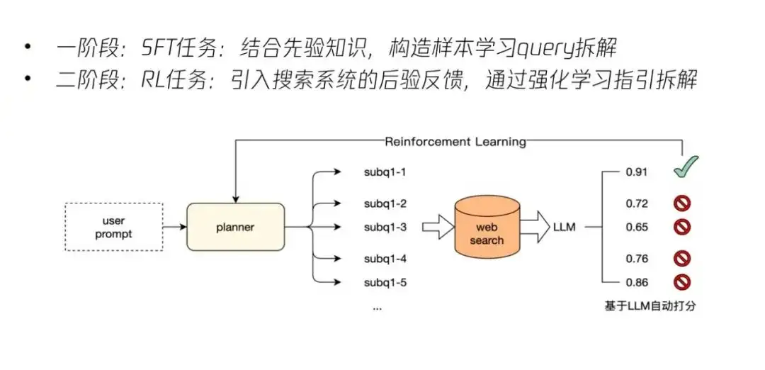 - 通过强化学习,让答案好坏影响排序,让排序结构影响 planing,实现端到端的效果优化。RL-Based Planner 利用检索排序效果反馈学习,query 拆解引入搜索满意信号,优化 subq 拆解,使 query 拆解任务下的搜索满意度提升;