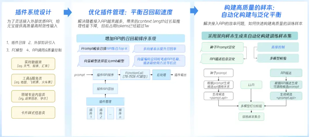 为灵活接入外部优质 API,给元宝提供高质量高时效性输入,我们开发了插件系统。相当于在传统搜索中接入合作 CP 的结构化数据,核心目标不变,但能力上有关键不同:从静态数据接入到动态理解,执行机制从固定召回到多插件智能体协同,扩展从定制开发到即插即用,插件系统将数据从 “资源” 升级为 “智能体协作网络中的敏捷生产力”。