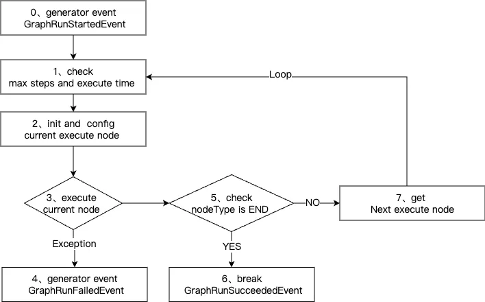 检查完GraphEngine当前可执行的基本条件之后,会通过NODE_TYPE_CLASSES_MAPPING 和用户配置的Node基本信息来初始化当前准备执行的节点实例对象,并进行执行。如果在这个过程中触发异常,GraphEngine会生成GraphRunFailedEvent事件,交给WorkflowAppRunner对事件进行发布;否则会检查节点是否为END结束节点,如果是结束节点,则退出循环,触发生成GraphRunSucceededEvent事件,如果不是END结束节点,则会基于DAG边的依赖关系,获取下游可执行的节点,继续在循环中执行节点。