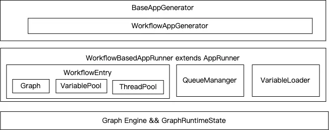 WorkflowAppGeneator生成WorkflowAppRunner运行时对象,WorkflowAppRunner基于用户设置的app输入参数、系统变量及环境变量、Workflow App节点编排关系初始化构建可运行的DAG Graph。