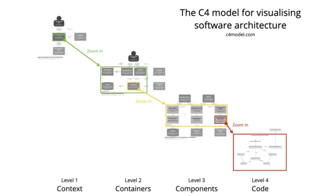 C4 模型基于4+1模型,但是也有些差异。如果说4+1重点是横看成岭侧成峰。那 C4 模型则是一窥到底的放大镜。