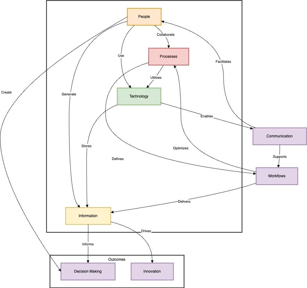 企业架构在组织的人(People)、流程(Processes)、技术(Technology)与信息/数据(Information/Data)之间连结各个点,目的在于帮助组织做出更明智、面向长期的决策——通过绘制“今天是如何运作”的图景,以及引导其迈向“明天可以到达”的状态。
