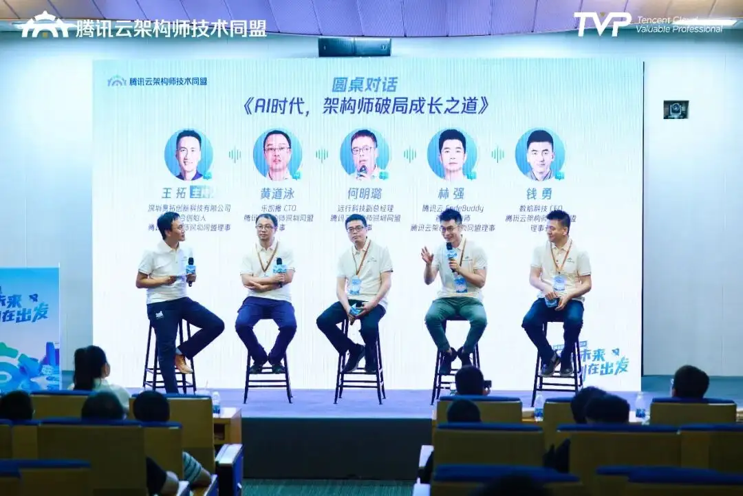 圆桌对话作为沙龙的亮点环节,在深圳易拓创新科技有限公司联合创始人、腾讯云架构师深圳同盟理事 王拓的主持下,围绕“AI 时代,架构师破局成长之道”主题,乐凯撒 CTO、腾讯云架构师深圳同盟理事 黄道泳,远行科技副总经理、腾讯云架构师深圳同盟理事 何明璐,腾讯云 CodeBuddy 首席架构师、腾讯云架构师深圳同盟理事 林强,数焰科技 CEO、腾讯云架构师深圳同盟理事长 钱勇从不同角度,分享他们对 AI 时代下架构师成长、进化的思考与建议。