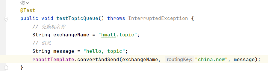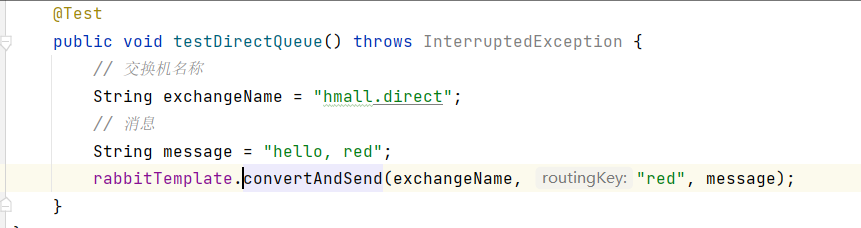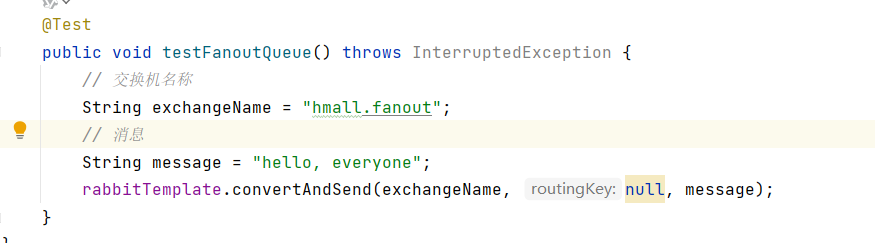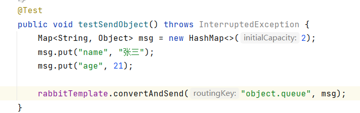 然后在publisher服务中编写测试类SpringAmqpTest,并利用RabbitTemplate实现消息发送: