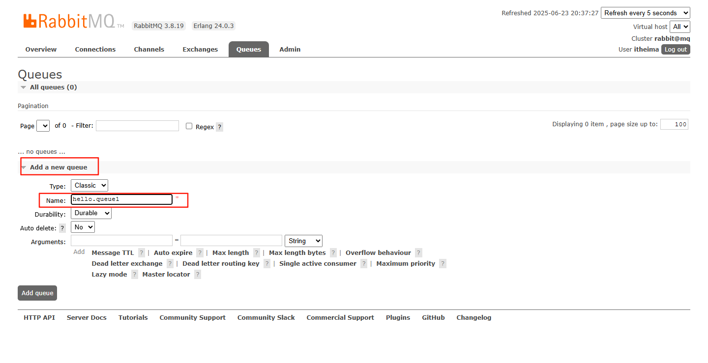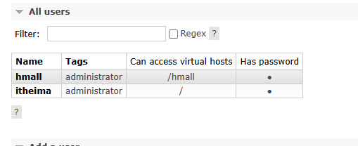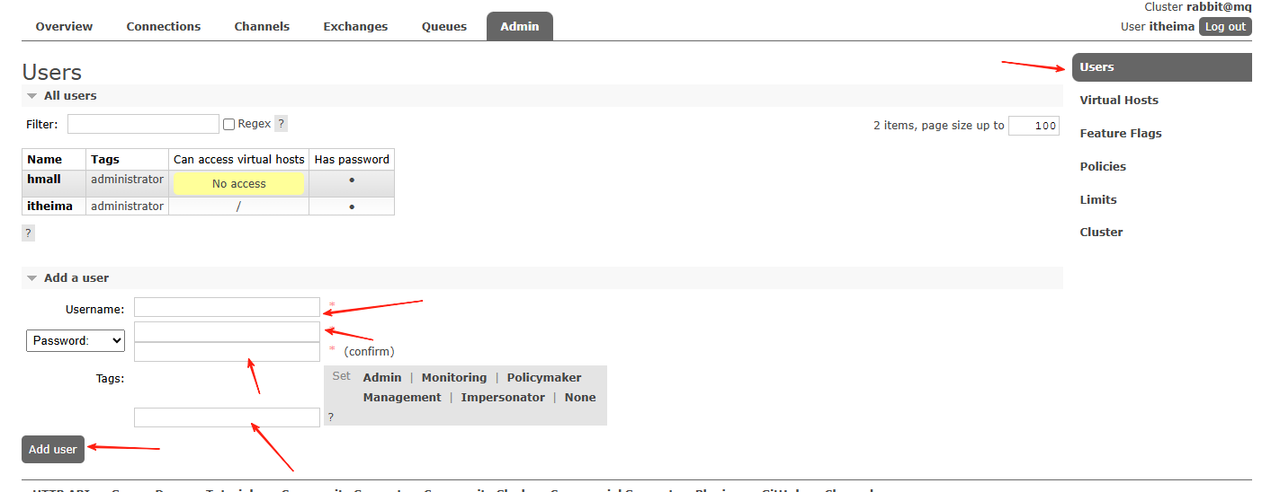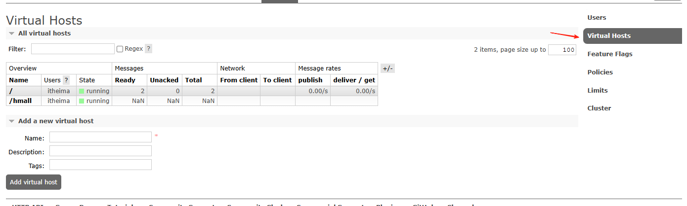 先创建一个用户,但是 Can access virtual hosts 是空的,需要创建虚拟主机并绑定