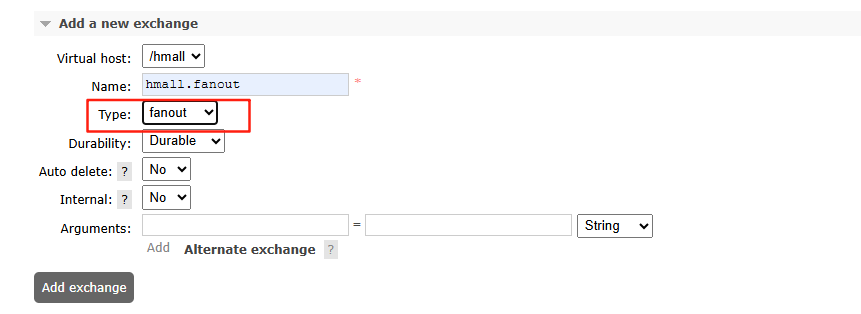 return ExchangeBuilder.fanoutExchange("hmall.fanout").build();