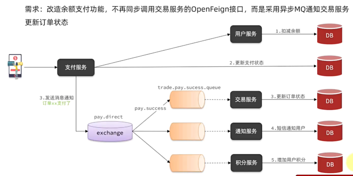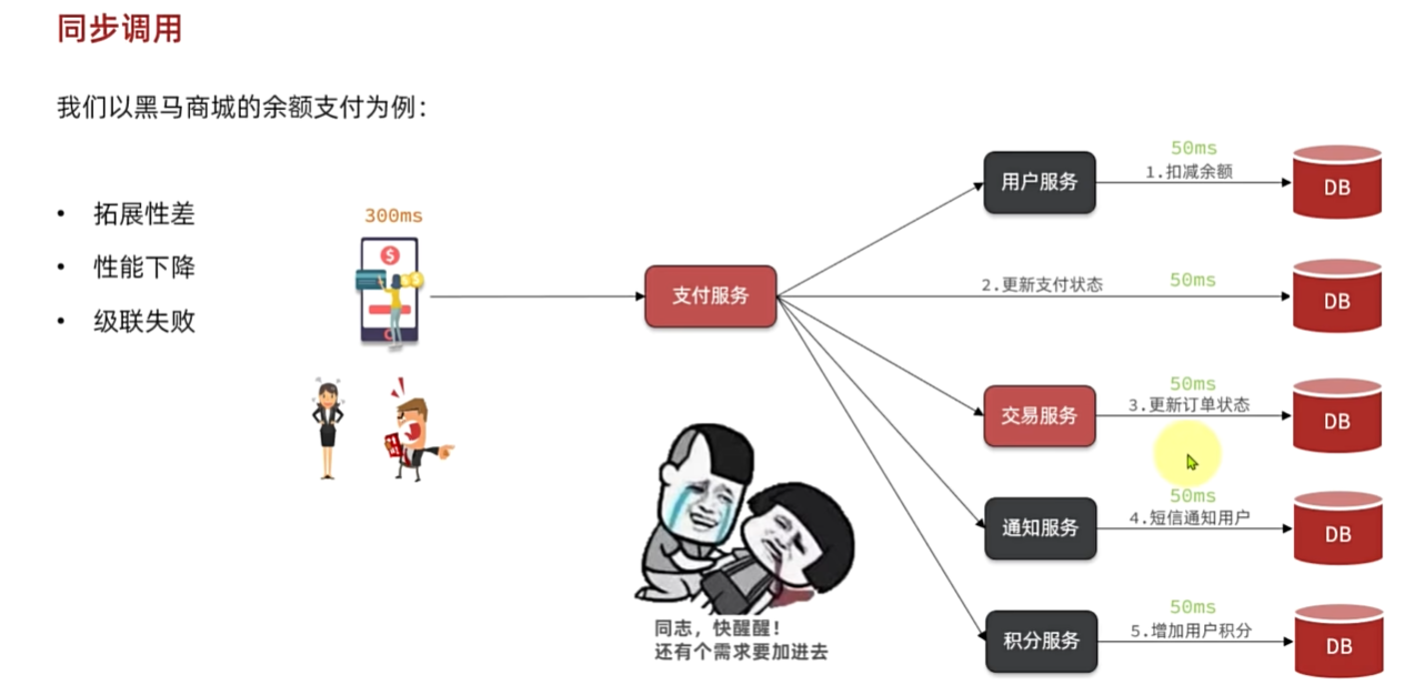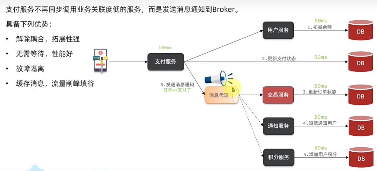 扣余额和更新支付状态之间有关系,但是支付成功以后,更新订单状态,发送短信,增加用户积分之间不存在必要的关联,如果依次执行,耗时很长,扩展性也很差