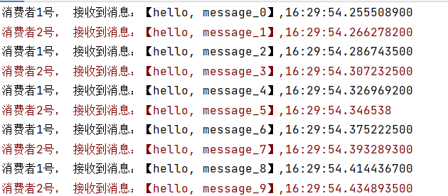 System.out.println("消费者1号, 接收到消息:【" + msg + "】,"+ LocalTime.now());