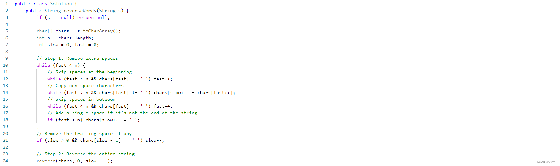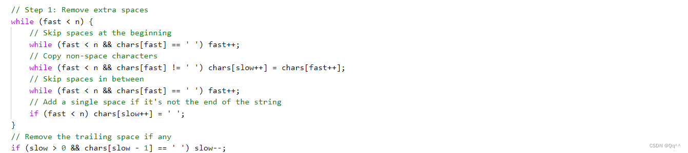 首先去除字符串中不必要的空格。这包括字符串开头和末尾的空格以及单词之间的多余空格。使用快慢指针。