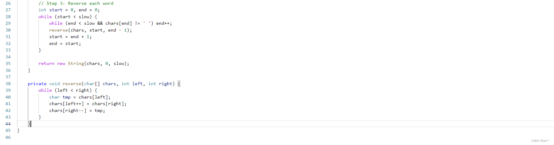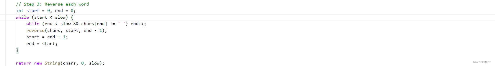 - 整体反转字符串:首先反转整个字符串。
