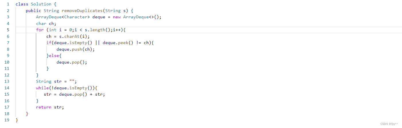 - 如果相同,说明发现了相邻重复项,将栈顶字符弹出(删除两个相邻的重复字符)。