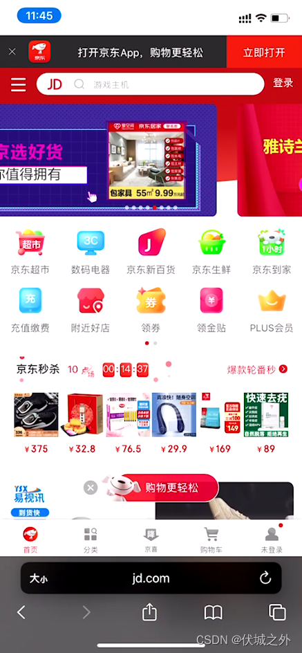 当我们网页按照理想视口开发时,此时网页可以完美地在手机屏幕中展示,此时我们是不希望用户对网页进行放大、缩小操作的,如下是京东的移动WEB网页